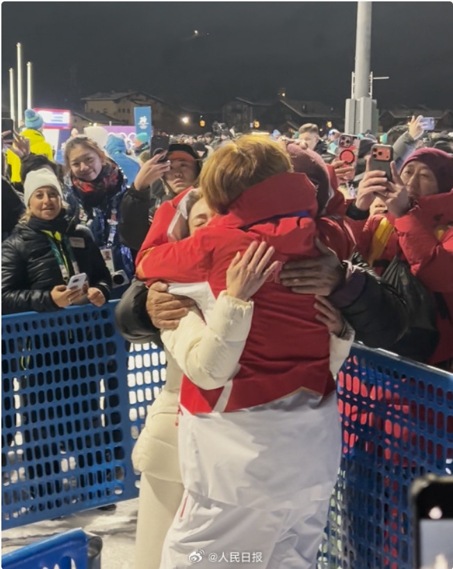 走下领奖台的苏翊鸣和父母深情相拥,泪洒赛场。